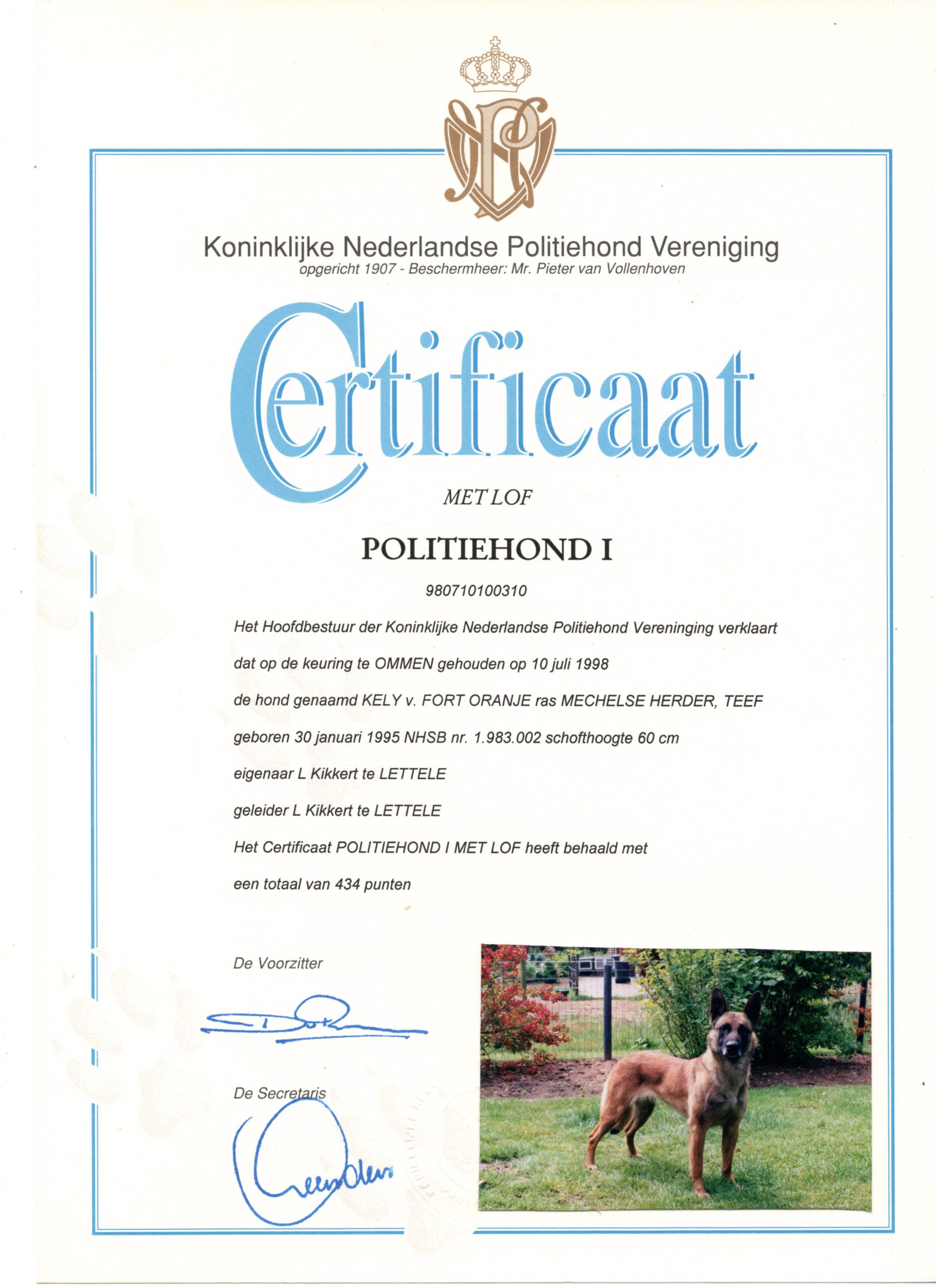 Kely van Fort Oranje PH I, 434 CL, te Ommen 1998, Surveillance diensthond (FCI Mechelse Herder)